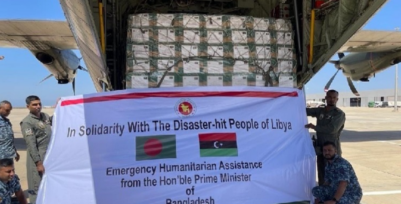লিবিয়ার বন্যাদুর্গত মানুষের জন্য বাংলাদেশ সরকার ওষুধ ও শুকনো খাবারসহ ত্রাণসামগ্রী পাঠিয়েছে। শুক্রবার বাংলাদেশ বিমানবাহিনীর একটি সি ১৩০ জে পরিবহন বিমান প্রয়োজনীয় সেসব সামগ্রী নিয়ে লিবিয়ায় পৌঁছায়।