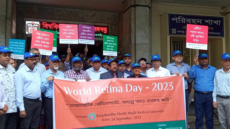 বঙ্গবন্ধু শেখ মুজিব মেডিক্যাল বিশ্ববিদ্যালয়ের (বিএসএমএমইউ) চক্ষু বিজ্ঞান বিভাগ ও বাংলাদেশ ভিট্রিওরেটিনা সোসাইটির যৌথ উদ্যোগে “ডায়াবেটিক রেটিনোপ্যাথি, অযত্নে বাড়ে চোখের ক্ষতি” প্রতিপাদ্য নিয়ে বিশ্ব রেটিনা দিবস ২০২৩ পালিত হয়েছে। দিবসটি উপলক্ষে আজ (২৪ সেপ্টেম্বর) একটি বর্ণাঢ্য শোভাযাত্রা আয়োজিত হয়।