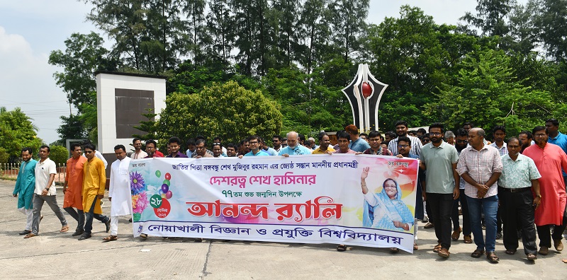 নোয়াখালী বিজ্ঞান ও প্রযুক্তি বিশ্ববিদ্যালয়ে (নোবিপ্রবি) প্রধানমন্ত্রী শেখ হাসিনার ৭৭তম জন্মদিন উদযাপিত হয়েছে। এ উপলক্ষে আজ বৃহস্পতিবার (২৮ সেপ্টেম্বর)  বেলা ১২টায় নোবিপ্রবির উপাচার্য অধ্যাপক ড. মোঃ দিদার-উল-আলমের নেতৃত্বে আনন্দ র‌্যালি, কেক কাটা, মিলাদ ও দোয়া অনুষ্ঠানের আয়োজন করা হয়।