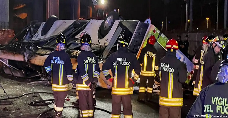 ইতালির ভেনিস শহরের কাছে একটি ফ্লাইওভার দিয়ে যাওয়ার সময় বাসটি নিচে পড়ে যায়। তারপরই তাতে আগুন লেগে যায়। এই দুর্ঘটনায় ২১ জন মারা গেছেন। এ সময় আহত হয়েছেন আরও ১৮ জন। ভেনিসের শহরতলি মেস্ত্রেতে এই ঘটনা ঘটেছে।