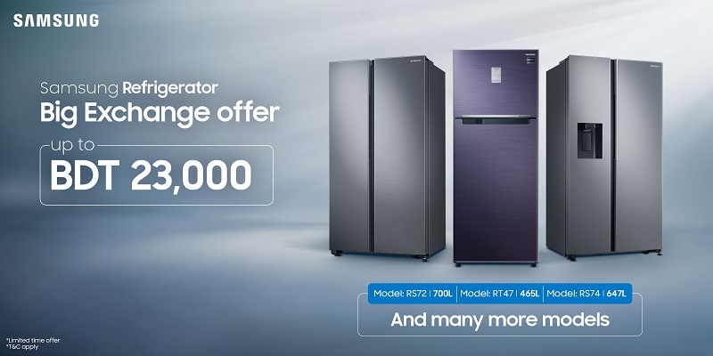 এক্সচেঞ্জ অফারের আওতায় স্যামসাংয়ের ৪৬৫ লিটার টুইন কুলিং রেফ্রিজারেটর (আরটি৪৭ মডেল) ক্রয়ের সময় গ্রাহকরা ১৮ হাজার টাকা পর্যন্ত ছাড় (এক্সচেঞ্জ অফার) পাবেন। এছাড়া, স্পেসম্যাক্স প্রযুক্তি সহ স্যামসাংয়ের সাইড বাই সাইড রেফ্রিজারেটর (আরএস৭২ ও আরএস৭৪ মডেল) কেনার সময় যথাক্রমে ২০ হাজার এবং ২৩ হাজার টাকা পর্যন্ত ছাড় (এক্সচেঞ্জ অফার) পাওয়া যাবে।