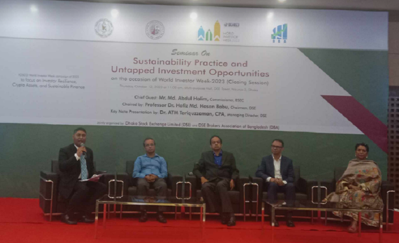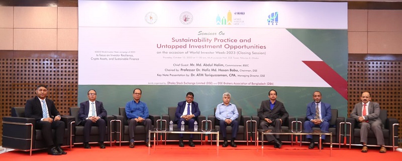 বৃহস্পতিবার (১২ অক্টোবর) বিশ্ব বিনিয়োগকারী সপ্তাহের অংশ হিসেবে ঢাকা স্টক এক্সচেঞ্জ লিমিটেড এবং ডিএসই ব্রোকারস এসোসিয়েশন অব বাংলাদেশ এর যৌথ উদ্যোগে ডিএসই মাল্টিপারপাস হলে “Sustainable Practice and Untapped Investment Opportunities” শীর্ষক এক সেমিনার অনুষ্ঠিত হয়। এতে প্রধান অতিথির বক্তব্যে তিনি এসব কথা বলেন।