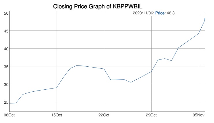 গত অক্টোবর মাসের ৮ তারিখে ঢাকা স্টক এক্সচেঞ্জে (ডিএসই) খান ব্রাদার্স পিপি ওভেন ব্যাগের শেয়ারের দাম ছিল ২৫ টাকা ৬০ পয়সা। আজ সোমবার (৬ নভেম্বর) কোম্পানিটির শেয়ারের মূল্য দাঁড়িয়েছে ৪৮ টাকা ৩০ পয়সা। এক মাসেরও কম সময়ের ব্যবধানে কোম্পানিটির শেযারের দাম বেড়েছে ৮৮ দশমিক ৬৭ শতাংশ।