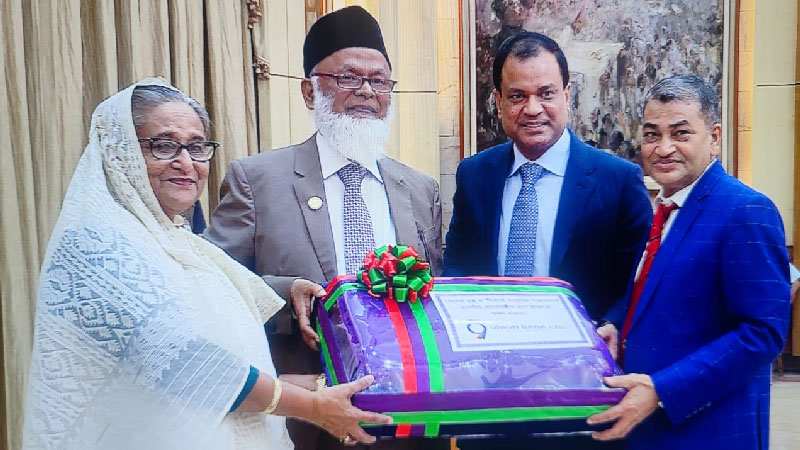 অনুষ্ঠানে প্রধানমন্ত্রী শেখ হাসিনার হাতে কম্বলের নমুনা হস্তান্তর করেন ইউনিয়ন ব্যাংকের চেয়ারম্যান অধ্যাপক ড. মোঃ সেলিম উদ্দিন এফসিএ এফসিএমএ এবং ব্যবস্থাপনা পরিচালক ও সিইও এ. বি. এম. মোকাম্মেল হক চৌধুরী।