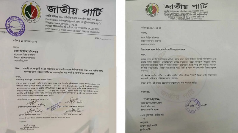মহাসচিব মুজিবুল হক চুন্নু স্বাক্ষরিত চিঠিতে বলা হয়েছে, গত বৃহস্পতিবার (১৬ নভেম্বর) ইসির উপসচিব মো. মাহবুব আলম শাহ স্বাক্ষরিত একটি ই-মেইল পেয়েছি। সেই ই-মেইলের আলোকে আপনাকে জানানো যাচ্ছে যে, জাতীয় পার্টির (নিবন্ধন নং-১২) পক্ষ থেকে আসন্ন জাতীয় সংসদ নির্বাচনে মনোনয়ন প্রদানের ক্ষেত্রে আরওপিও অনুযায়ী সংসদ সদস্য পদে রাজনৈতিক দলের মনোনীত প্রার্থী নির্বাচনে জাতীয় পার্টির ক্ষমতাপ্রাপ্ত ব্যক্তি হিসেবে দলের প্রার্থী মনোনয়ন ও প্রতীক বরাদ্দ করবেন- জাতীয় পার্টির চেয়ারম্যান গোলাম মোহাম্মদ কাদের এমপি।