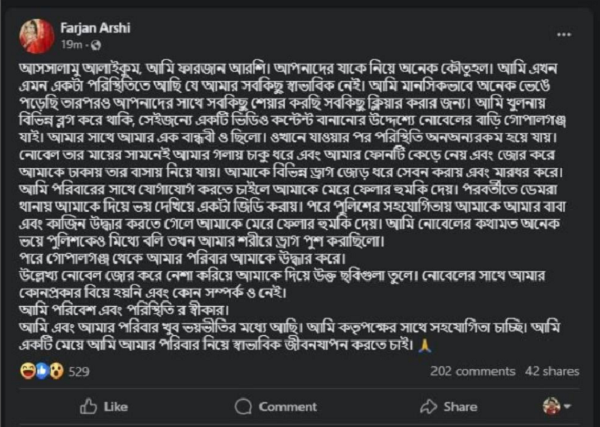 বুধবার (২২ নভেম্বর) বিকেলে ফেসবুকে ফারজান আরশি জানান, ‘আমি খুলনায় বিভিন্ন ব্লগ করে থাকি, সেজন্য একটি ভিডিও কন্টেন্ট বানানোর উদ্দেশ্যে নোবেলের বাড়ি গোপালগঞ্জ যাই। আমার সঙ্গে আমার এক বান্ধবীও ছিল। ওখানে যাওয়ার পর পরিস্থিতি অন্যরকম হয়ে যায়। নোবেল তার মায়ের সামনেই আমার গলায় ছুরি ধরে এবং আমার ফোনটি কেড়ে নেয় এবং জোর করে আমাকে ঢাকায় তার বাসায় নিয়ে যায়। আমাকে বিভিন্ন ড্রাগ জোড় ধরে সেবন করায় এবং মারধর করে। আমি পরিবারের সঙ্গে যোগাযোগ করতে চাইলে আমাকে মেরে ফেলার হুমকি দেয়।’
