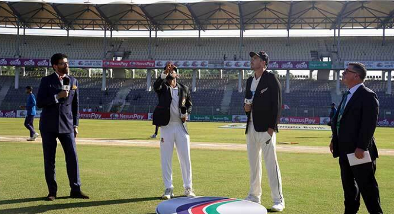 নতুন টেস্ট অধিনায়ক নাজমুল হোসেন শান্ত টস করতে নামলেন নিউজিল্যান্ড অধিনায়ক টিম সাউদির সঙ্গে। টস জিতলেন বাংলাদেশ অধিনায়ক এবং টস জিতে প্রথমে ব্যাট করারই সিদ্ধান্ত নিলেন তিনি।
