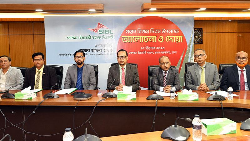 মহান বিজয় দিবস উপলক্ষে সোশ্যাল ইসলামী ব্যাংকের প্রধান কার্যালয়ে সম্প্রতি আলোচনা সভা ও দোয়া অনুষ্ঠিত হয়েছে। এতে প্রধান অতিথি হিসেবে উপস্থিত ছিলেন ব্যাংকের ব্যবস্থাপনা পরিচালক ও প্রধান নির্বাহী জাফর আলম।