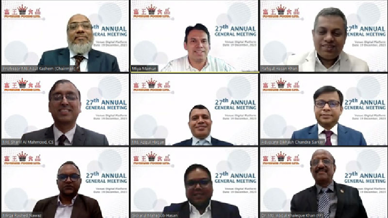 ফু-ওয়াং ফুডস লিমিটেডের ২৭ তম বার্ষিক সাধারণ সভা মঙ্গলবার (১৯ ডিসেম্বর) সকাল ১১ টায় ডিজিটাল প্লাটফর্র্মে অনুষ্ঠিত হয়েছে। সভায় সভাপতিত্ব করেন কোম্পানির পরিচালনা পর্ষদের চেয়ারম্যান প্রফেসর মোঃ আবুল কাশেম।