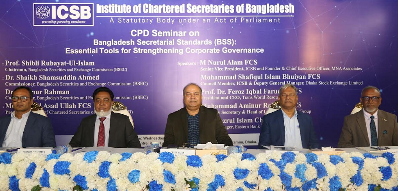 বুধবার (২৭ ডিসেম্বর) রাজধানীর ঢাকা ক্লাবের স্যামসন এইচ. চৌধুরী অডিটোরিয়ামে ইনস্টিটিউট অব চার্টার্ড সেক্রেটারিজ অব বাংলাদেশ (আইসিএসবি) আয়োজিত ‘বাংলাদেশ সেক্রেটারিয়াল স্ট্যান্ডার্ডস-এর উপর ক্রমাগত পেশাদার উন্নয়ন (বিএসএস): কর্পোরেট গভর্নেন্সকে শক্তিশালী করার জন্য প্রয়োজনীয় সরঞ্জাম শীর্ষক এক সেমিনারে প্রধান অতিথির বক্তব্যে বিএসইসি চেয়ারম্যান এসব কথা বলেন।
