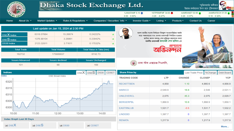 দিনভর লেনদেন হওয়া ৩৩৮ কোম্পানি ও মিউচ্যুয়াল ফান্ডের মধ্যে দর বেড়েছে ১০১ টির, দর কমেছে ৬৮ টির এবং দর অপরিবর্তিত রয়েছে ১৬৯ টির।