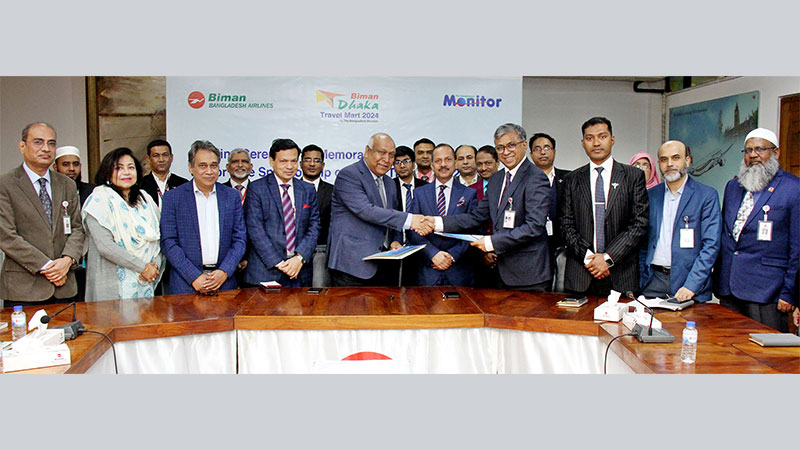 আজ সোমবার (১৫ জানুয়ারি) রাজধানীর বলাকা ভবনে বিমান বাংলাদেশ এয়ারলাইন্সের ব্যবস্থাপনা পরিচালক ও প্রধান নির্বাহী শফিউল আজিমের উপস্থিতিতে এতদ্বসংক্রান্ত একটি সমঝোতা স্মারক স্বাক্ষর করেন বাংলাদেশ মনিটর সম্পাদক কাজী ওয়াহিদুল আলম এবং বিমানের ভারপ্রাপ্ত পরিচালক- বিপনন ও বিক্রয় মোহাম্মদ সালাউদ্দীন।