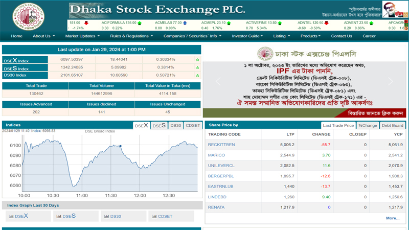 জানা গেছে, সোমবার দুপুর ১ টায় ডিএসই ব্রড ইনডেক্স আগের দিনের চেয়ে ১৮ পয়েন্ট বেড়ে অবস্থান করছে ৬ হাজার ৯৭ পয়েন্টে। অন্য সূচকগুলোর মাঝে ডিএসই শরিয়াহ সূচক – ডিএসইএস ৫ পয়েন্ট বেড়ে অবস্থান করছে ১ হাজার ৩৪২ পয়েন্টে এবং ডিএসই–৩০ সূচক ১০ পয়েন্ট কমে অবস্থান করছে ২ হাজার ১০১ পয়েন্টে।
