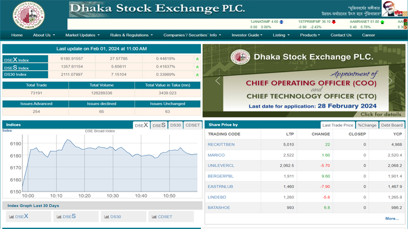 জানা গেছে, এদিন সকাল ১১ টায় ডিএসই ব্রড ইনডেক্স আগের দিনের চেয়ে ২৭ পয়েন্ট বেড়ে অবস্থান করছে ৬ হাজার ১৮০ পয়েন্টে। অন্য সূচকগুলোর মাঝে ডিএসই শরিয়াহ সূচক – ডিএসইএস ৫ পয়েন্ট বেড়ে অবস্থান করছে ১ হাজার ৩৫৭ পয়েন্টে এবং ডিএসই–৩০ সূচক ৭ পয়েন্ট বেড়ে অবস্থান করছে ২ হাজার ১১১ পয়েন্টে।