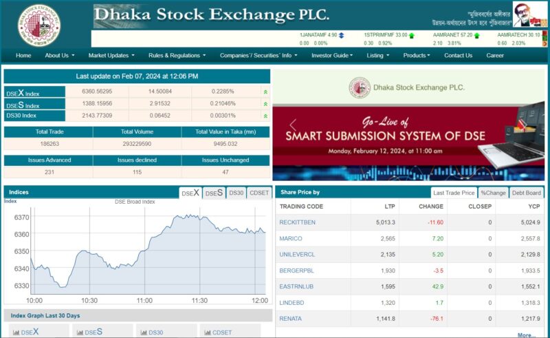 সপ্তাহের চতুর্থ কার্যদিবস বুধবার (০৭ ফেব্রুয়ারি) ঢাকা স্টক এক্সচেঞ্জে (ডিএসই) মূল্য সূচকের উত্থানে লেনদেন চলছে। এদিন লেনদেন শুরুর প্রথম ২ ঘন্টায় বৃদ্ধি পেয়েছে বেশিরভাগ কোম্পানির শেয়ার দর।