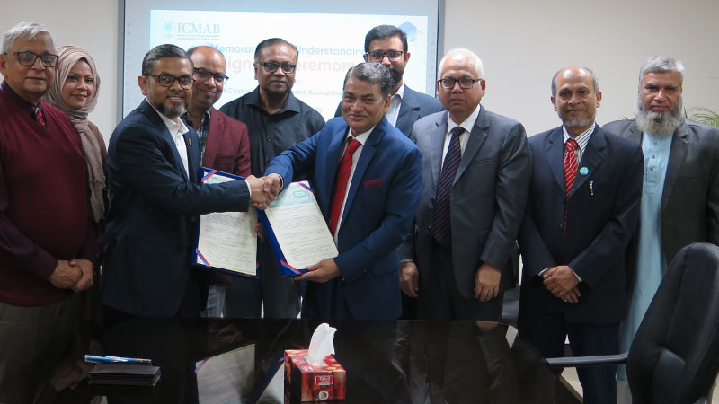 উভয় প্রতিষ্ঠানের শীর্ষস্থানীয় প্রতিনিধিদের উপিস্থিতিতে আইসিএমএবির প্রেসিডেন্ট অধ্যাপক ড. মোঃ সেলিম উদ্দিন এফসিএ, এফসিএমএ এবং ইস্ট ওয়েস্ট ইউনিভার্সিটির প্রো-ভাইস চ্যান্সেলর প্রফেসর ড. মোহাম্মদ আশিক মোসাদ্দিক এ সমঝোতা স্মারকে স্বাক্ষর করেন।