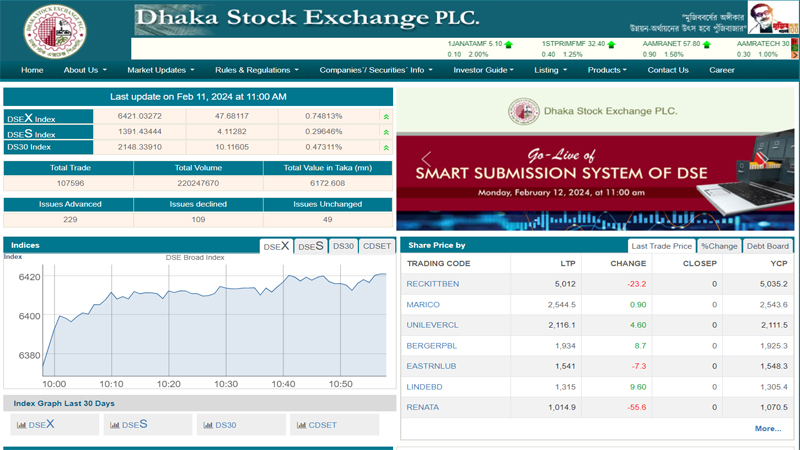 সপ্তাহের প্রথম কার্যদিবস রোববার (১১ ফেব্রুয়ারি) ঢাকা স্টক এক্সচেঞ্জে (ডিএসই) সব সূচকের উর্ধমুখী ধারায় চলছে লেনদেন। এদিন লেনদেন শুরুর প্রথম ঘন্টায় বৃদ্ধি পেয়েছে বেশিরভাগ কোম্পানির শেয়ার দর।