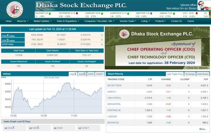 সপ্তাহের তৃতীয় কার্যদিবস মঙ্গলবার (১৩ ফেব্রুয়ারি) ঢাকা স্টক এক্সচেঞ্জে (ডিএসই) মূল্য সূচকের উত্থানে চলছে লেনদেন। এদিন লেনদেন শুরুর প্রথম দেড় ঘন্টায় বেড়েছে বেশিরভাগ কোম্পানির শেয়ার দর।