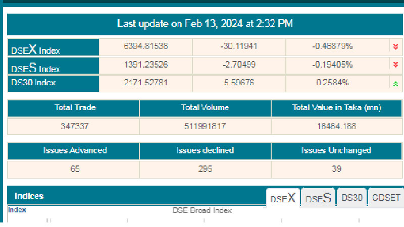 জানা গেছে, আজ ডিএসইতে অধিকাংশ কোম্পানির শেয়ারের দর কমেছে। এদিন ডিএসইর প্রধান সূচক ‘ডিএসইএক্স’ ৩০ দশমিক ১১ পয়েন্ট কমে ৬ হাজার ৩৯৪ পয়েন্টে নেমে আসে।
