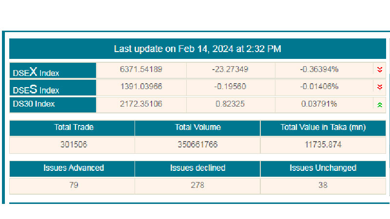 এদিন ডিএসইর প্রধান সূচক ‘ডিএসইএক্স’ ২৩ দশমিক ২৭ পয়েন্ট কমে ৬ হাজার ৩৭১ পয়েন্টে নেমে আসে।