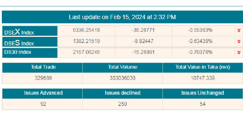 এদিন ডিএসইর প্রধান সূচক ‘ডিএসইএক্স’ ৩৫ দশমিক ২৮ পয়েন্ট কমে ৬ হাজার ৩৩৬ পয়েন্টে নেমে আসে।