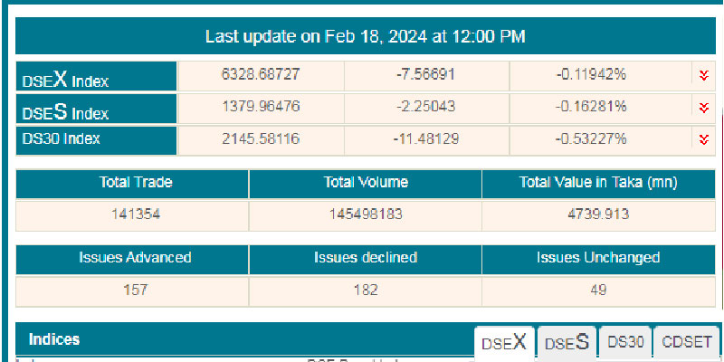 সপ্তাহের প্রথম কার্যদিবস রবিবার (১৮ ফেব্রুয়ারি) ঢাকা স্টক এক্সচেঞ্জে (ডিএসই) মূল্য সূচকের পতনে চলছে লেনদেন। এদিন লেনদেন শুরুর প্রথম দুই ঘন্টায় কমেছে বেশিরভাগ কোম্পানির শেয়ার দর।