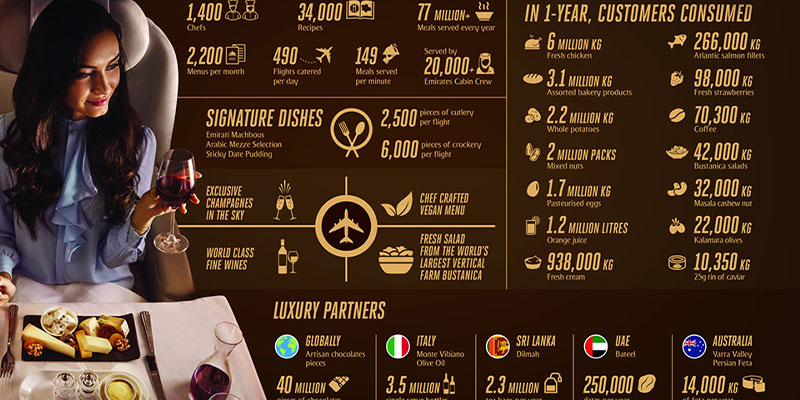 নিজস্ব ও অন্যান্য এয়ারলাইনের ফ্লাইটে পরিবেশিত সুস্বাদু খাবারের পরিমান, পরিবেশনা এবং এসকল খাবার প্রস্তুতকারী শেফদের নিয়ে বেশ কিছু মজাদার তথ্য প্রকাশ করেছে এমিরেটস এয়ারলাইন। এয়ারলাইনটি প্রতি বছর ৭৭মিলিয়নের অধিক মীল পরিবেশন করে থাকে।
