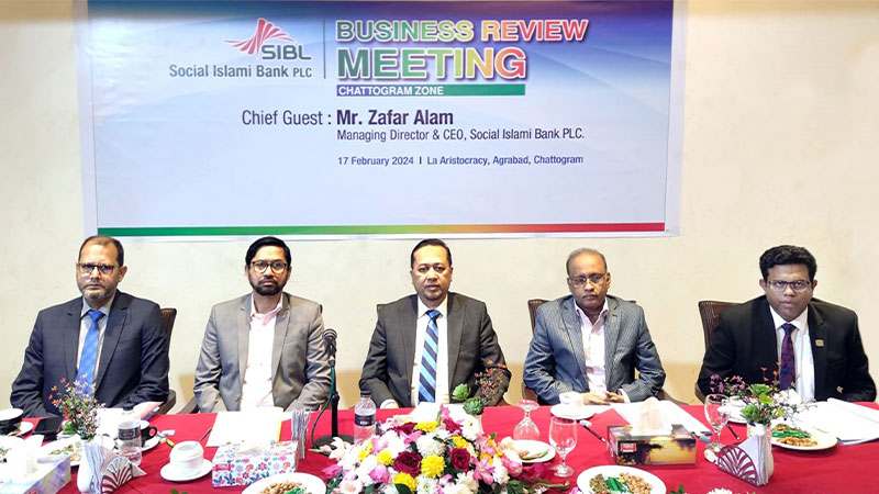 সোশ্যাল ইসলামী ব্যাংকের চট্টগ্রাম অঞ্চলের বিজনেস রিভিউ মিটিং শনিবার (১৭ ফেব্রুয়ারি) লা এ্যারিস্ট্রাক্রেসি হোটেলে অনুষ্ঠিত হয়েছে। অনুষ্ঠানে প্রধান অতিথি হিসেবে উপস্থিত ছিলেন ব্যাংকের ব্যবস্থাপনা পরিচালক ও প্রধান নির্বাহী জাফর আলম।