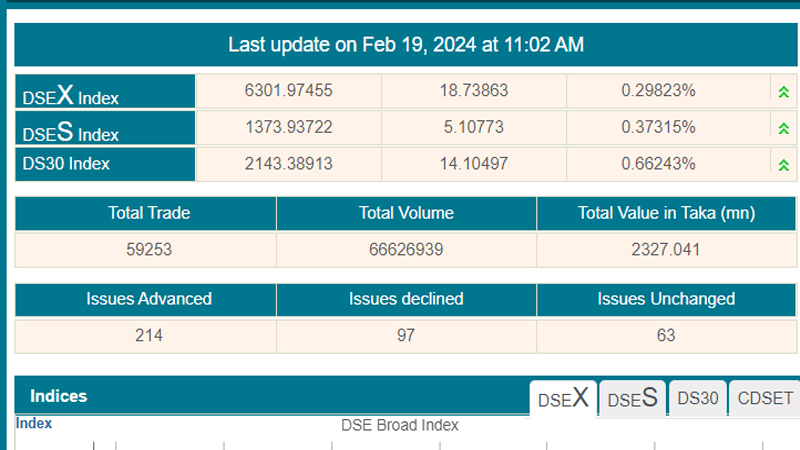 বাজার বিশ্লেষণে দেখা যায়, ডিএসই প্রধান বা ডিএসইএক্স সূচক ১৮ দশমিক ৭৩ পয়েন্ট বেড়ে অবস্থান করছে ৬ হাজার ৩০১ পয়েন্টে। অন্য সূচকগুলোর মধ্যে ডিএসইএস বা শরীয়াহ সূচক ৫ দশমিক ১০ পয়েন্ট বেড়ে অবস্থান করছে ১ হাজার ৩৭৩ পয়েন্টে এবং ডিএস৩০ সূচক ১৪ দশমিক ১০ পয়েন্ট বেড়ে দাঁড়িয়েছে ২ হাজার ১৪৩ পয়েন্টে।