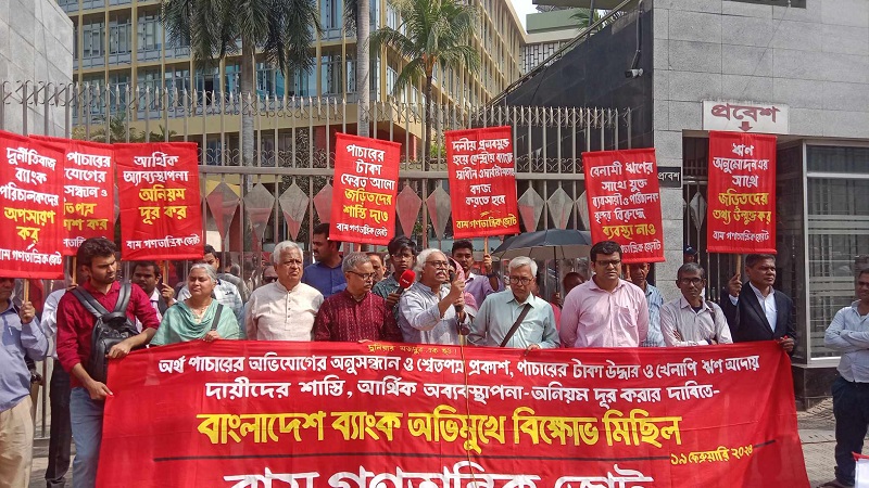 সোমবার (১৯ ফেব্রুয়ারি) বাংলাদেশ ব্যাংকের সামনে পূর্ব ঘোষিত কর্মসূচির অংশ হিসেবে এ বিক্ষোভ করে বাম মোর্চার রাজনৈতিক সংগঠনগুলো। এদিকে দুপুর সাড়ে ১২টার দিকে শুরু হওয়া বিক্ষোভের কারণে সোনালী ব্যাংকের বিপরীতে বাংলাদেশ ব্যাংকের প্রবেশ গেইটটি প্রায় এক ঘণ্টা বন্ধ থাকে। এ সময় বিক্ষোভকারীরা ব্যাংকের টাকা লুটপাট ও অর্থ পাচারকারীদের শাস্তিসহ সরকারের পদত্যাগের দাবি করেন। পাশাপাশি অর্থ পাচারের অভিযোগ অনুসন্ধান ও শ্বেতপত্র প্রকাশেরও দাবি করেন তারা।