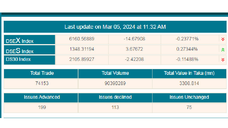বাজার বিশ্লেষণ করে দেখা যায়, ডিএসই প্রধান বা ডিএসইএক্স সূচক ১৪ দশমিক ৬৭ পয়েন্ট কমে অবস্থান করছে ৬ হাজার ১৬০ পয়েন্টে। অন্য সূচকগুলোর মধ্যে ডিএসইএস বা শরীয়াহ সূচক ৩ দশমিক ৬৭ পয়েন্ট বেড়ে অবস্থান করছে ১ হাজার ৩৪৮ পয়েন্টে এবং ডিএস৩০ সূচক ২ দশমিক ৪২ পয়েন্ট কমে দাঁড়িয়েছে ২ হাজার ১০৫ পয়েন্টে।