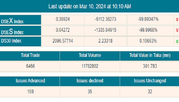 আজ রোববার (১০ মার্চ) সপ্তাহের প্রথম কার্যদিবসের শুরুতেই ওয়েবসাইটে এই বিভ্রান্তি দেখা দেয়। সকাল ১০টায় স্টক এক্সচেঞ্জে লেনদেন শুরু হয়। তখন থেকেই ওয়েবসাইটে ভুল তথ্য দেখানো শুরু হয়। সকাল ১০টা ১০ মিনিটে ওয়েবসাইটে প্রদত্ত তথ্য অনুসারে, ডিএসই ব্রড ইনডেক্স ডিএসইএক্স আগের দিনের চেয়ে ৬ হাজার ১২ দশমিক ৩৬ পয়েন্ট বা ৯৯ দশমিক ৯৯ শতাংশ কমে দশমিক ৩৯ পয়েন্ট দাঁড়িয়েছে। অথচ তথন পর্যন্ত বাজারে ২২৬টি কোম্পানির শেয়ার কেনাবেচা হয়েছে, যার মধ্যে ১৫৯টি কোম্পানির শেয়ারের দাম বেড়েছে, যা লেনদেনে অংশ নেওয়া কোম্পানিগুলোর ৭০ দশমিক ৩২ শতাংশ।