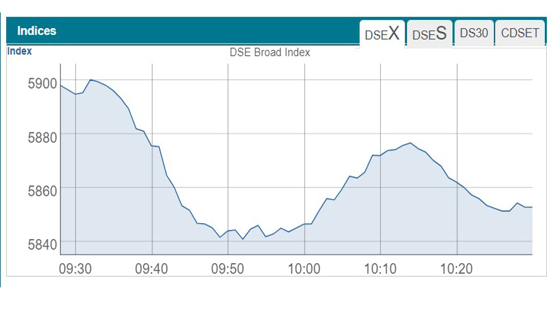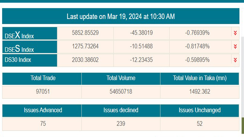 বাজার বিশ্লেষণ করে দেখা যায়, লেনদেনের প্রথম ঘন্টাতেই ৪৫ দশমিক ৩৮ পয়েন্ট পতনের পর ডিএসই প্রধান বা ডিএসইএক্স সূচক ৫ হাজার ৮৫২ পয়েন্টে অবস্থান করছে।