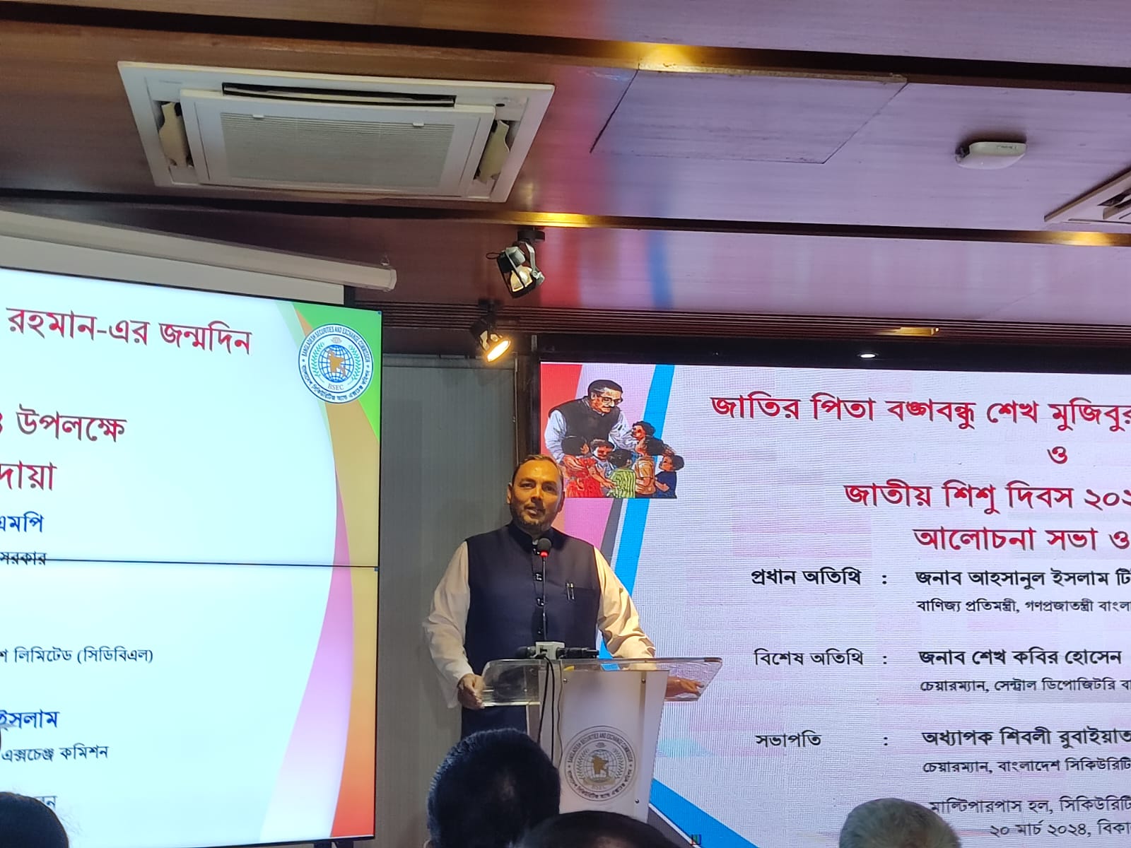 বুধবার (২০ মার্চ) রাজধানীর আগারগাঁওয়ে সিকিউরিটিজ আ্যান্ড কমিশন ভবনে জাতির পিতা বঙ্গবন্ধু শেখ মুজিবুর রহমানের জন্মদিন ও জাতীয় শিশু দিবস উপলক্ষে আলোচনা সভা এবং দোয়া অনুষ্ঠানে প্রধান অতিথির বক্তব্যে তিনি এসব কথা বলেন। অনুষ্ঠানের সভাপতিত্ব করেন বাংলাদেশ সিকিউরিটিজ অ্যান্ড এক্সচেঞ্জ কমিশনের (বিএসইসি) চেয়ারম্যান অধ্যাপক শিবলী রুবাইয়াত-উল-ইসলাম।