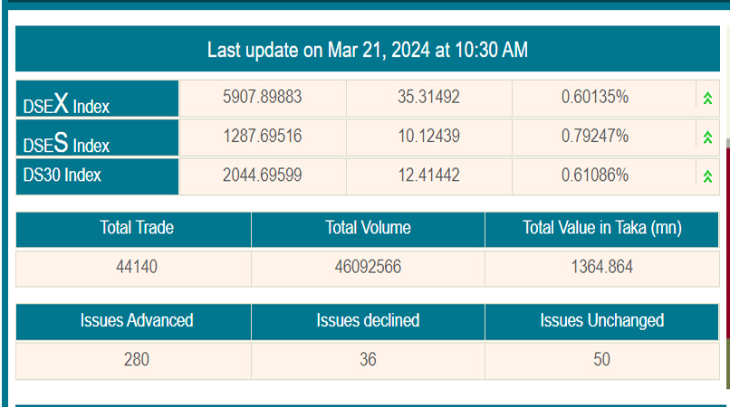 বাজার বিশ্লেষণ করে দেখা যায়, লেনদেনের প্রথম ঘন্টায় ৩৫ দশমিক ৩১ পয়েন্ট উত্থানের পর ডিএসই প্রধান বা ডিএসইএক্স সূচক ৫ হাজার ৯০৭ পয়েন্টে অবস্থান করছে।