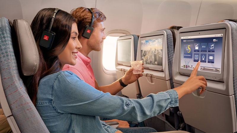 এমিরেটসের ইনফ্লাইট বিনোদন ব্যবস্থা প্রায় ৩০ বছর পূর্বে যাত্রা শুরু করে এবং অন্যতম প্রথম এয়ারলাইন ইকোনমি শ্রেণীর যাত্রীদের জন্য সীটব্যাক ভিডিও প্রবর্তন করে। বিশ্বের প্রথম এয়ারলাইন হিসেবে এমিরেটস ভিন্নভাবে সক্ষম যাত্রীদের জন্য অডিও ডেস্ক্রিপ্টিভ সাউন্ড ট্র্যাক এবং ছায়াছবির ক্লোজড ক্যাপশন চালু করে।