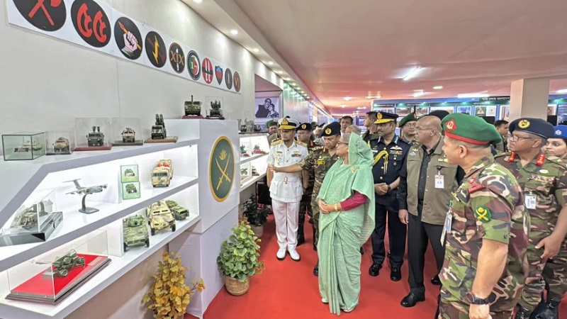শেখ হাসিনা তিন বাহিনীর বিভিন্ন স্টল ও প্যাভিলিয়ন ঘুরে দেখেন এবং সংশ্লিষ্ট কর্মকর্তারা সমরাস্ত্র সম্পর্কে তাকে ব্রিফ করার সময় সেনা, নৌ ও বিমান বাহিনীর সৈন্যদের ব্যবহৃত বিভিন্ন হালকা ও ভারী অস্ত্র প্রত্যক্ষ করেন।