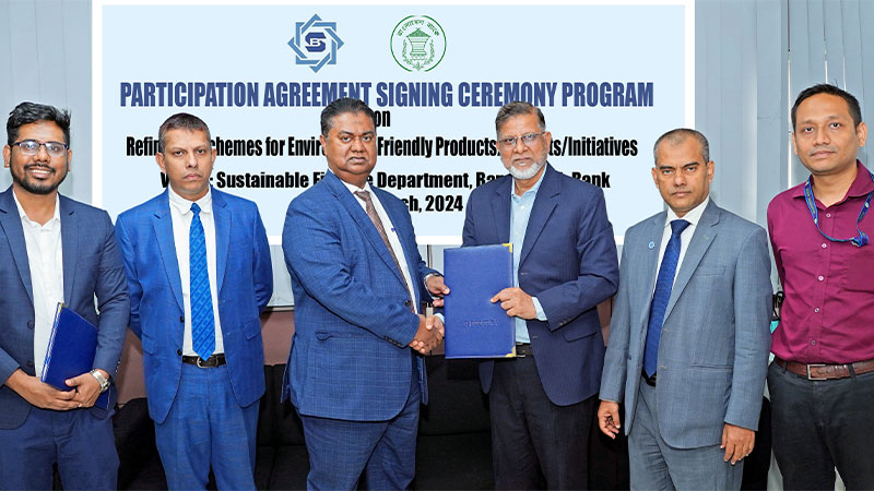 বাংলাদেশ ব্যাংক কর্তৃক নির্ধারিত পরিবেশবান্ধব পণ্য/প্রকল্প/উদ্যোগে অর্থায়নকে ত্বরান্বিতকরণের লক্ষ্যে সম্প্রতি বাংলাদেশ ব্যাংকের সাসটেইনেবল ফাইন্যান্স ডিপার্টমেন্টের সঙ্গে শাহ্জালাল ইসলামী ব্যাংক পিএলসি’র একটি অংশগ্রহণমূলক চুক্তি স্বাক্ষরিত হয়েছে।