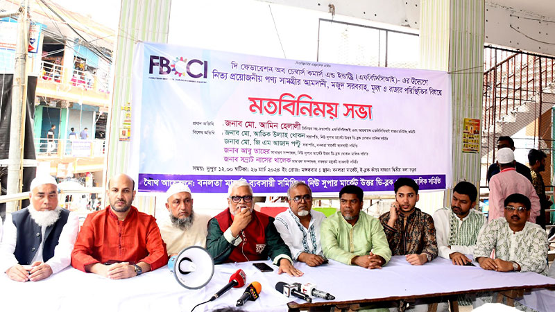 মঙ্গলবার (২৬ মার্চ) বিকেলে নিত্য প্রয়োজনীয় পণ্য সামগ্রীর আমদানি, মজুদ, সরবরাহ, মূল্য ও বাজার পরিস্থিতি বিষয়ক এক মতবিনিময় সভায় এই মন্তব্য করেন এফবিসিসিআইর সিনিয়র সহ-সভাপতি মো. আমিন হেলালী। এফবিসিসিআইর উদ্যোগে বনলতা মার্কেট ব্যবসায়ী সমিতি ও নিউ সুপার মার্কেট (উঃ) ডি-ব্লক দোকান মালিক সমিতি যৌথভাবে এই মতবিনিময় সভার আয়োজন করে। সভায় সভাপতিত্ব করেন নিউ সুপার মার্কেট (উঃ) ডি-ব্লক দোকান মালিক সমিতির সভাপতি আতিক উল্যাহ।