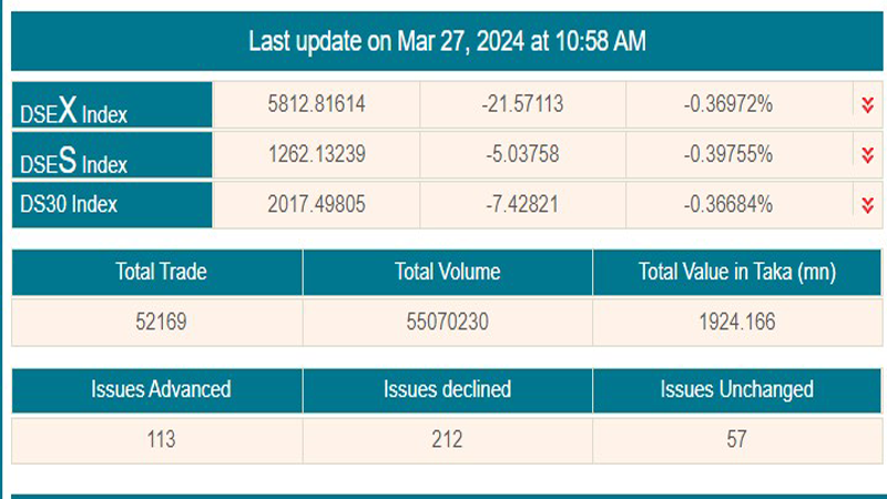 বাজার বিশ্লেষণ করে দেখা যায়, লেনদেন শুরুর ১ ঘন্টা ৩০ মিনিটে ২১ দশমিক ৫৭ পয়েন্ট পতনের পর ডিএসই প্রধান বা ডিএসইএক্স সূচক ৫ হাজার ৮১২ পয়েন্টে অবস্থান করছে।