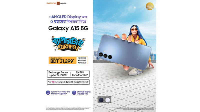 ক্রেতাদের স্মার্টফোন ব্যবহারের অভিজ্ঞতায় তাক লাগাতে এবার স্যামসাং বাংলাদেশে নিয়ে এলো গ্যালাক্সি এ১৫ ৫জি। ৫ হাজার মিলিঅ্যাম্পিয়ারের সুবিশাল ব্যাটারি ও সুপার অ্যামোলেড ডিসপ্লের মাধ্যমে এ অসাম ডিভাইস নিশ্চিত করবে দিনভর গেমিং ও স্ট্রিমিংয়ের দারুণ অভিজ্ঞতা!