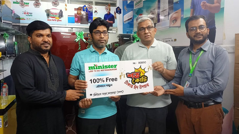 মিনিস্টার ইলেকট্রনিক্সের রেফ্রিজারেটর কিনে আরেকটি রেফ্রিজারেটর ফ্রি পেলেন মোহাম্মদপুর এলাকার বাসিন্দা মোঃ আসাদৃজ্জামান সুমন। সম্প্রতি মিনিস্টার কোম্পানি কর্তৃক ঘোষিত “জব্বর ব্যাপার: শত কোটি টাকার ঈদ উপহার” অফারের আওতায় ঢাকার মোহাম্মদপুরের ঢাকা উদ্যানে অবস্থিত মিনিস্টারের নিজস্ব শো-রুম থেকে ‘এম ২৪২’ মডেলের একটি রেফ্রিজারেটর কিনে স্ক্র্যাচ কার্ড ঘষে তিনি আরেকটি রেফ্রিজারেটর ফ্রি পান।