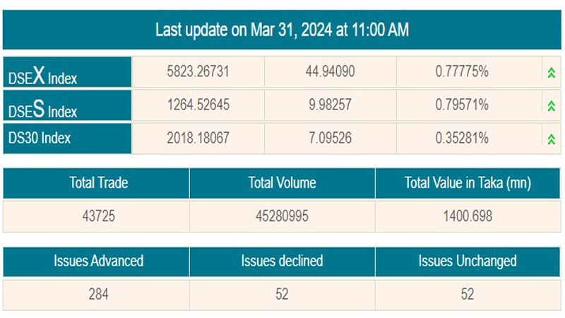 বাজার বিশ্লেষণ করে দেখা যায়, লেনদেন শুরুর ১ ঘন্টা ৩০ মিনিটে ৪৪ দশমিক ৯৪ পয়েন্ট উত্থানের পর ডিএসই প্রধান বা ডিএসইএক্স সূচক ৫ হাজার ৮২৩ পয়েন্টে অবস্থান করছে।