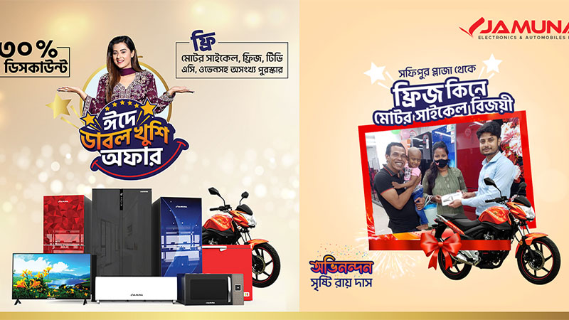 ঈদ আমাদের জাতীয় জীবনের সবচেয়ে বড় উৎসব। ঈদ মানে আনন্দ, ঈদ মানে খুশী, আর এই ঈদের খুশীকে সর্বজনীন করতে যমুনা ইলেক্ট্রনিক্স এন্ড অটোমোবাইলস এর পণ্যে চলছে “ডাবল খুশী অফার”। এ অফারে যমুনা রেফ্রিজারেটর, ফ্রিজার, এলইডি টিভি, এসি, মাইক্রোওয়েভ ওভেন ক্রয় করে রেজিস্ট্রেশন করলেই ক্রেতারা পাচ্ছেন মোটর সাইকেল, ফ্রিজ, এসি, স্মার্ট টিভি, ওভেনসহ অসংখ্য হোম অ্যাপলায়েন্স জিতে নেয়ার সুবর্ণ সুযোগ। এছাড়া যমুনা পণ্য কিনলেই ৩০% পর্যন্ত নগদ ডিসকাউন্ট।