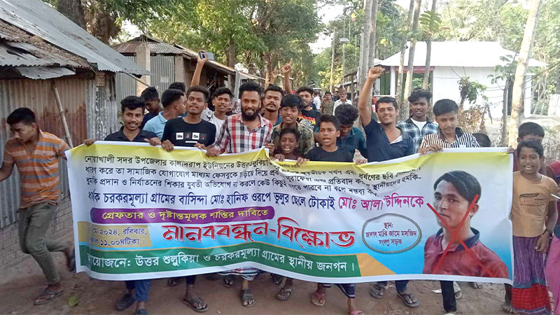 যুবতীকে ধর্ষণ এবং ধর্ষণের ছবি মোবাইলে ধারণ করে সামাজিক যোগাযোগ মাধ্যম ফেসবুকে ছড়িয়ে দিয়ে সামাজিক অবক্ষয় সৃষ্টি করার প্রতিবাদে এবং অভিযুক্ত ধর্ষককে গ্রেপ্তারপূর্বক শাস্তির দাবিতে মানববন্ধন ও বিক্ষোভ করেছে এলাকাবাসী। এমন ঘটনা ঘটেছে নোয়াখালী সদর উপজেলার কালাদরাপ ইউনিয়নের উত্তর শুল্লুকিয়া গ্রামে।