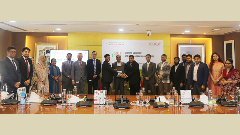 মিউচুয়াল ট্রাস্ট ব্যাংক পিএলসি (এমটিবি) এবং আইপিডিসি ফাইন্যান্স লিমিটেডের মধ্যে সম্প্রতি এমটিবি’র প্রধান কার্যালয়ে ক্যাশ ম্যানেজমেন্ট সেবা বিষয়ক একটি চুক্তি স্বাক্ষরিত হয়েছে।