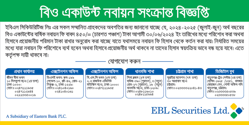 ইবিএল সিকিউরিটিজ লিমিটেড এর বিও একাউন্ট নবায়ন সংক্রান্ত জরুরী বিজ্ঞপ্তি প্রকাশ 2024-05-28 11:18:58 Tweet