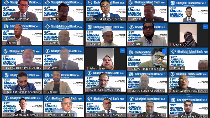 শাহ্জালাল ইসলামী ব্যাংক পিএলসি’র ২৩তম বার্ষিক সাধারণ সভা (এজিএম) বৃহস্পতিবার (৩০ মে) ডিজিটাল প্লাটফর্মে (অনলাইন ভিডিও কনফারেন্সের মাধ্যমে) অনুষ্ঠিত হয়েছে। সভায় সভাপতিত্ব করেন ব্যাংকের পরিচালক পর্ষদের চেয়ারম্যান এ. কে. আজাদ।