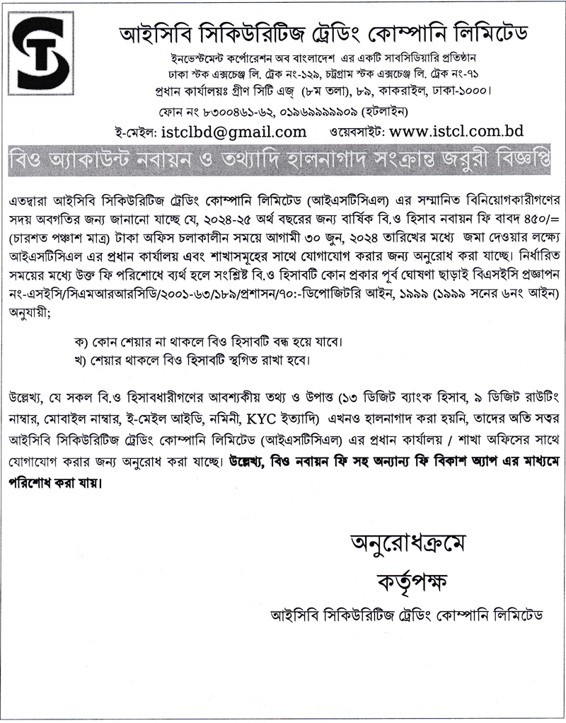 আইসিবি সিকিউরিটিজ ট্রেডিং কোম্পানি লিমিটেড এর বিও একাউন্ট নবায়ন সংক্রান্ত জরুরী বিজ্ঞপ্তি প্রকাশ 2024-06-01 10:39:32 Tweet