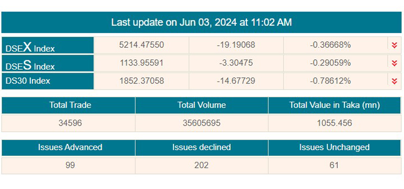 জানা গেছে, বেলা ১১ টায় ডিএসই ব্রড ইনডেক্স আগের দিনের চেয়ে ১৯ পয়েন্ট কমে অবস্থান করছে ৫ হাজার ২১৪ পয়েন্টে। আর ডিএসই শরিয়াহ সূচক ৩ পয়েন্ট কমে অবস্থান করছে ১ হাজার ১৩৩ পয়েন্টে এবং ডিএস৩০ সূচক ১৪ পয়েন্ট কমে অবস্থান করছে ১ হাজার ৮৫২ পয়েন্টে।